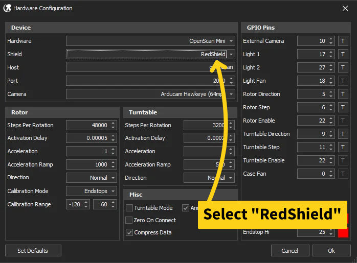 7. To enable this mod in OpenScan Composer attach the connector to GPIO pin 22, open the hardware configuration dialog, and change your Shield Type to “RedShield”.