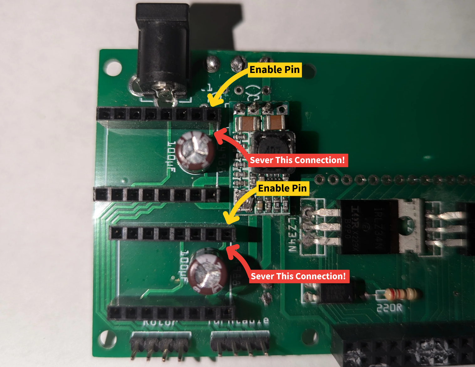 2. Using a small hand drill or an Xacto knife, sever the two connections which connect the motor driver ENABLE pins and GND, being careful not to damage the surrounding components.